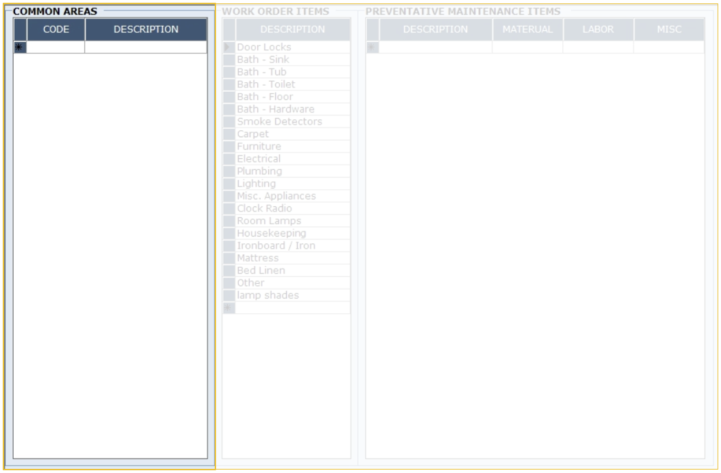 The property is composed of guest rooms and common areas like the lobby, the dining room, and even the swimming pool. Build-out areas of the hotel (other than guest rooms) where you may need to have a maintenance ticket or routine preventive maintenance performed.