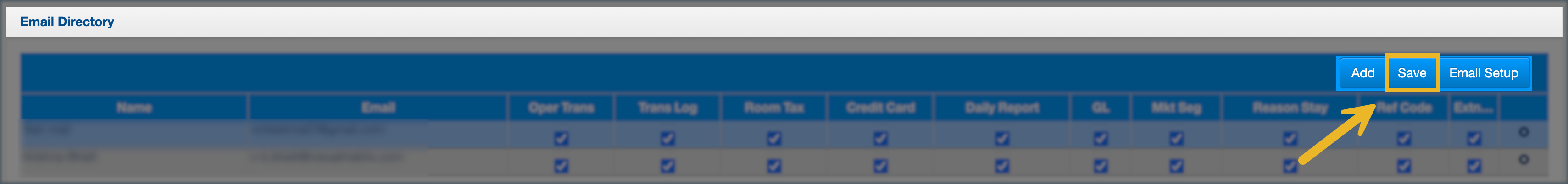 This setup defines who receives reports, not when they are sent. Report generation and email delivery occur during: Accounting > Night Audit > Reprint Reports > Generate Reports.