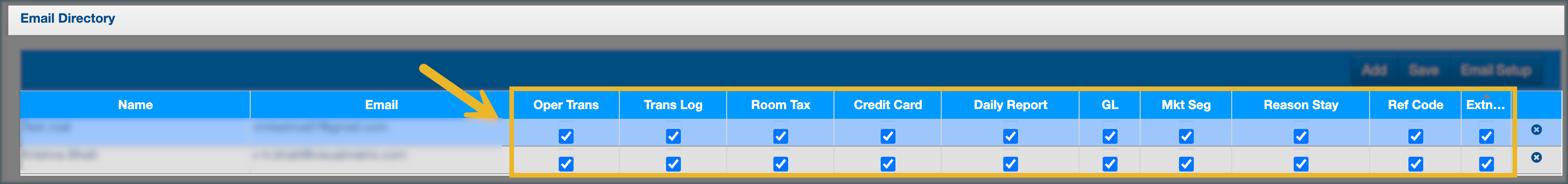 3. Select the reports the recipient should receive by checking the corresponding boxes across the columns (e.g., Daily Report, Credit Card, Room Tax, GL).