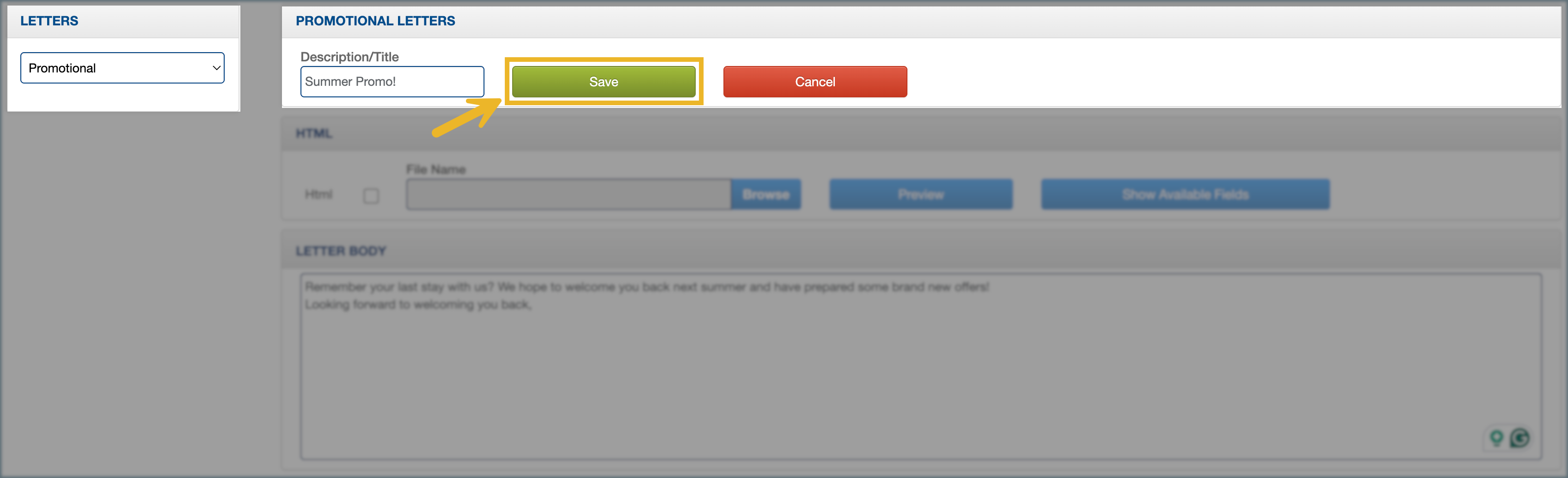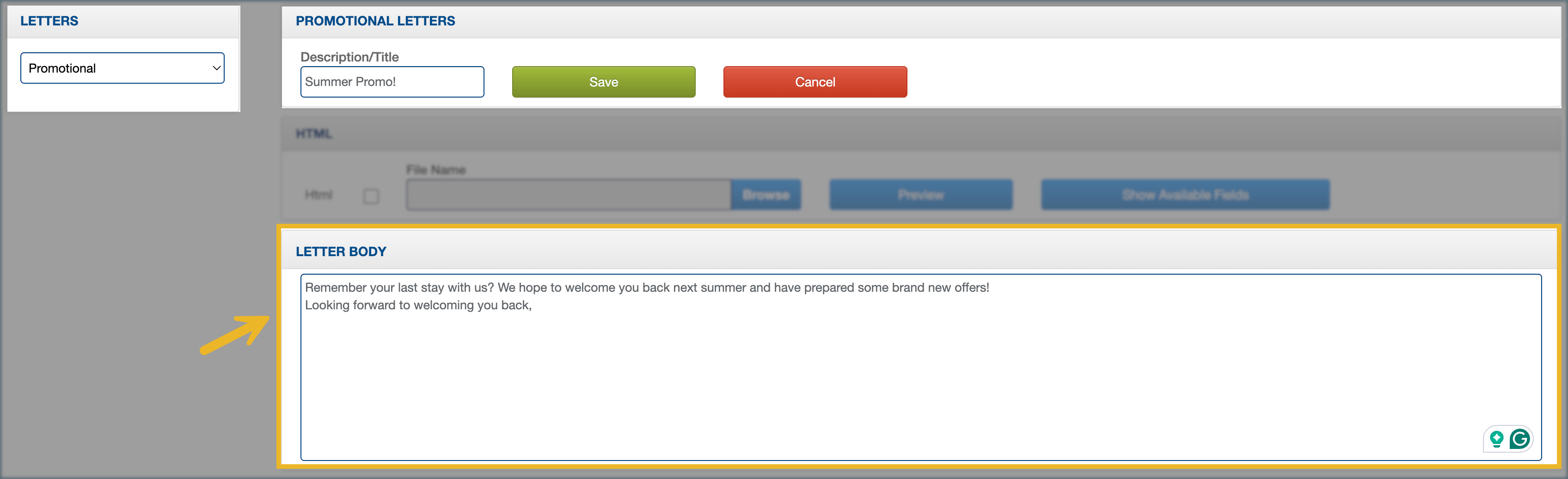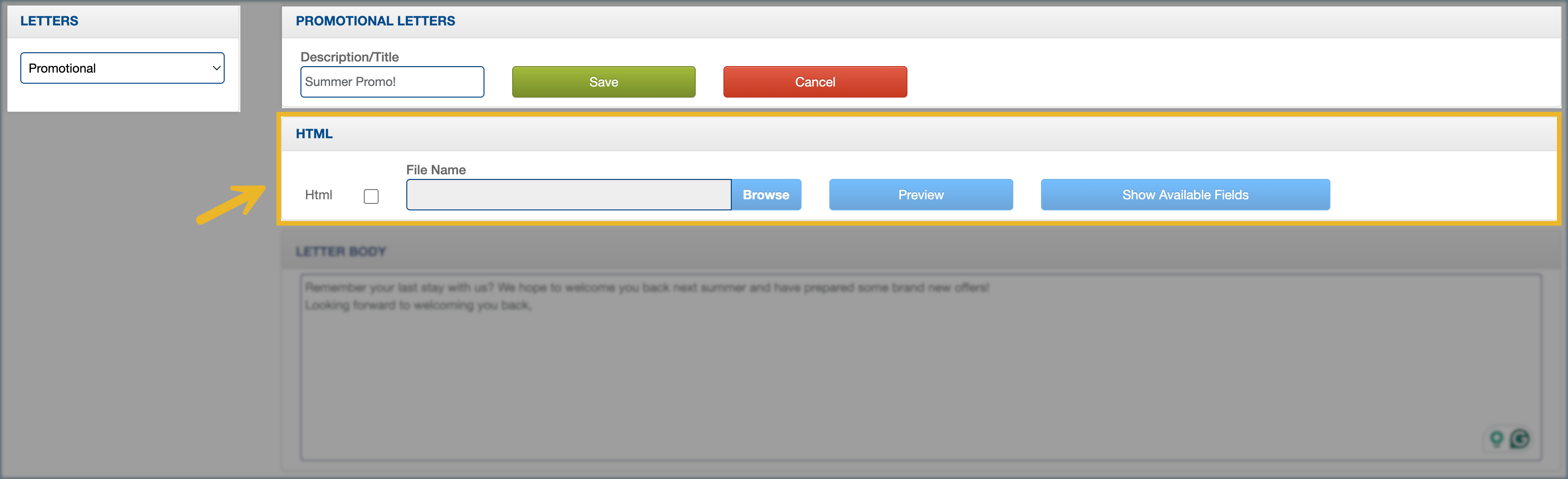 7. (Optional) Click Show Available Fields to view the reservation data fields (placeholders) that can be inserted into your HTML template.