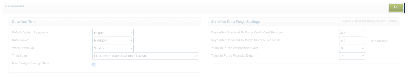 Path: Management > Property Settings > Parameters > Section "Date And Time" (top left)