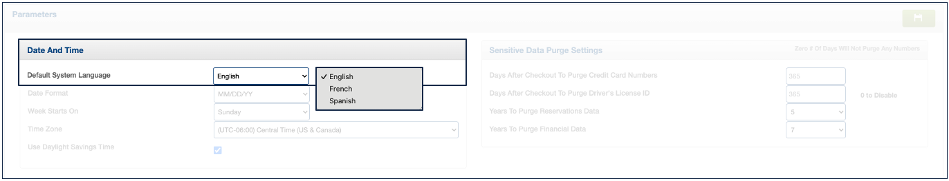 In this section, you have the option to select from three languages: English, Spanish, and French. However, it's essential to understand that this choice is limited to reports like the night audit re-print reports and does not translate the entire application into these languages. The application language is configured on a per-user basis and can be adjusted within each user's settings in the "Management - User Settings" section.