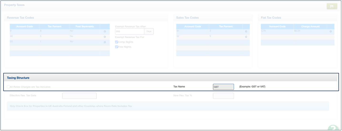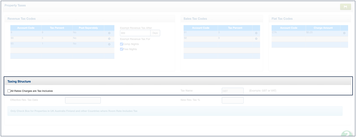 3. Check the box "All Rates Charges are Tax Inclusive" in the Taxing Structure.