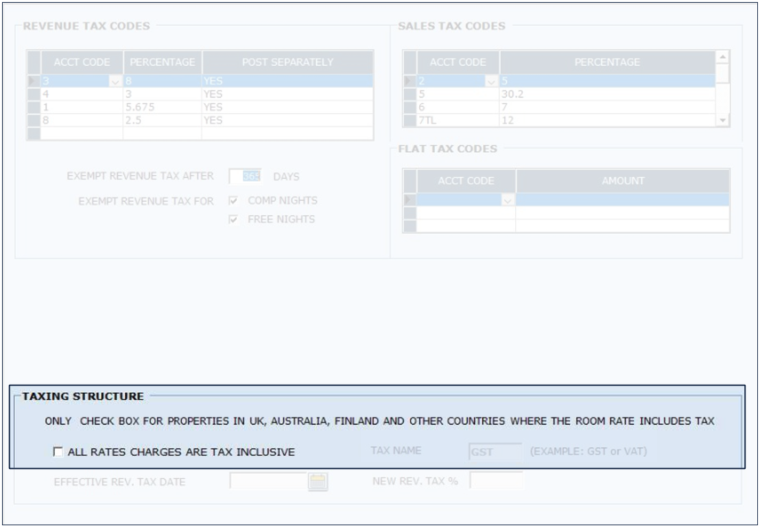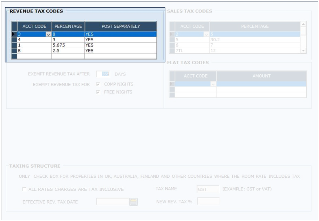 This section is to enable Room Revenue Tax as included in the room rates. This setting only allows one Revenue Tax. The revenue tax can be exempted.