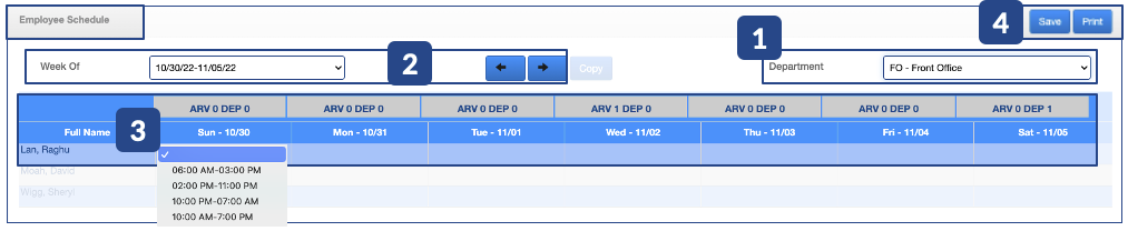 1. Select the Department for which you are creating the schedule. Every users from this department will automatically prompt from the User Settings. 2. Select the week you are creating the schedule for, or navigate to previous or futur weeks.