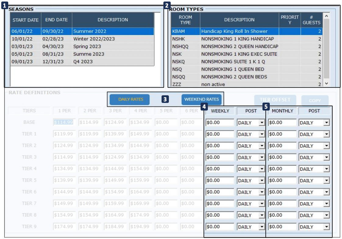 ? Watch Video Visual Matrix allows you to create up to 12 different rates per room type per season (base rate + 9 tiers + weekly rates + monthly rates). Path: Management > Setup > Rates > Room Rates 1. Select the season. 2. Select the Room Type. 3. ...