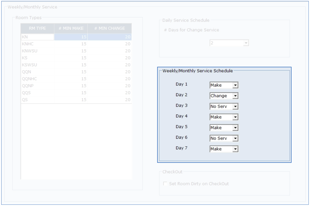 Go to the "Weekly/Monthly Service Schedule" section and choose when will the room be Make, Change or no Service during a 7 days period (a week).
