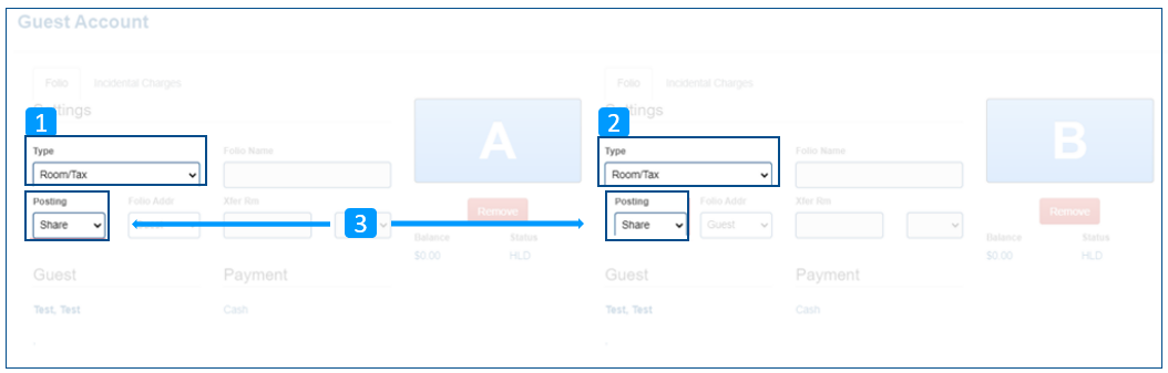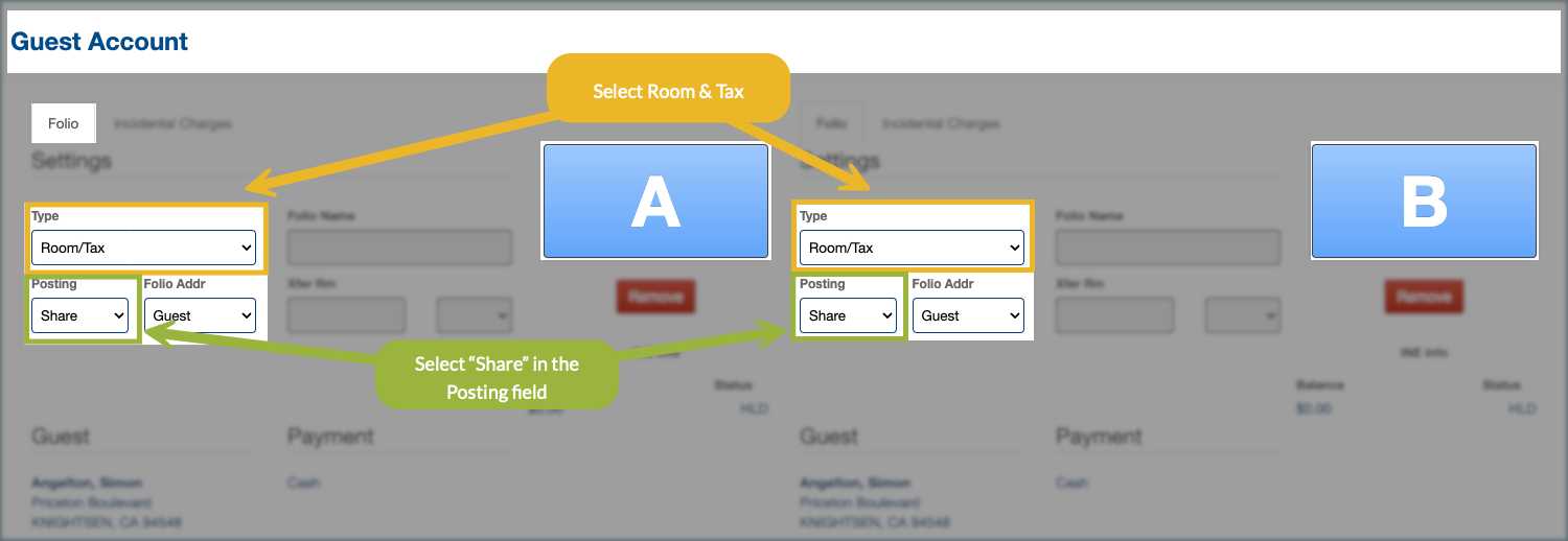 - Screenshots of Folio A/B showing Type = Room & Tax and Posting = Share.