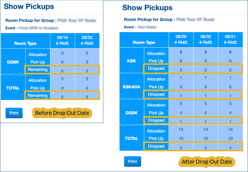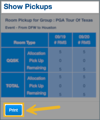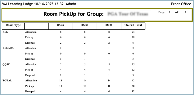 The Show Pickups feature displays how many rooms in a group block have been allocated, picked up, and how many remain or have been dropped. This view helps you track group performance, manage inventory, and identify rooms that can still be picked up—or that were released after the drop date. The report updates in real time as rooms are picked up or dropped and is useful for both the front desk and group coordinators monitoring group progress.