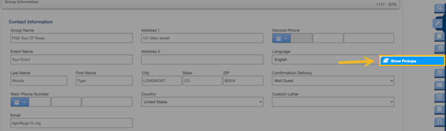 Path: Front Office > Group > Search > Open the Group > Show Pickups (in the toolbox on the right).