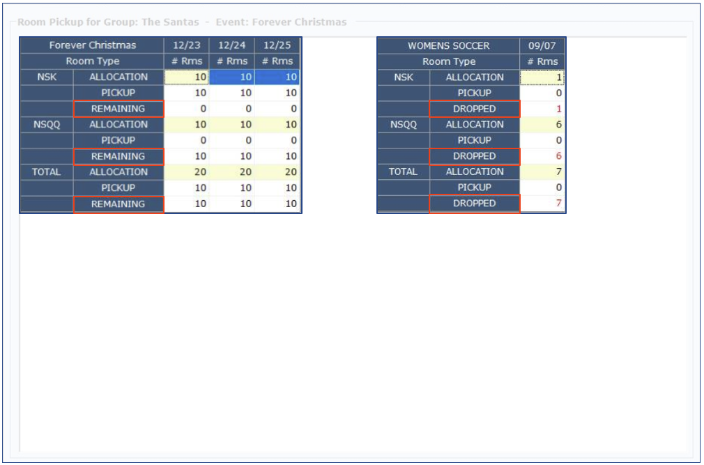 Group pick ups is a recap that will tell you by room type (and in total) and by date, how many rooms were allocated, how many were picked up and how many are remaining or dropped, if the drop out date is passed.