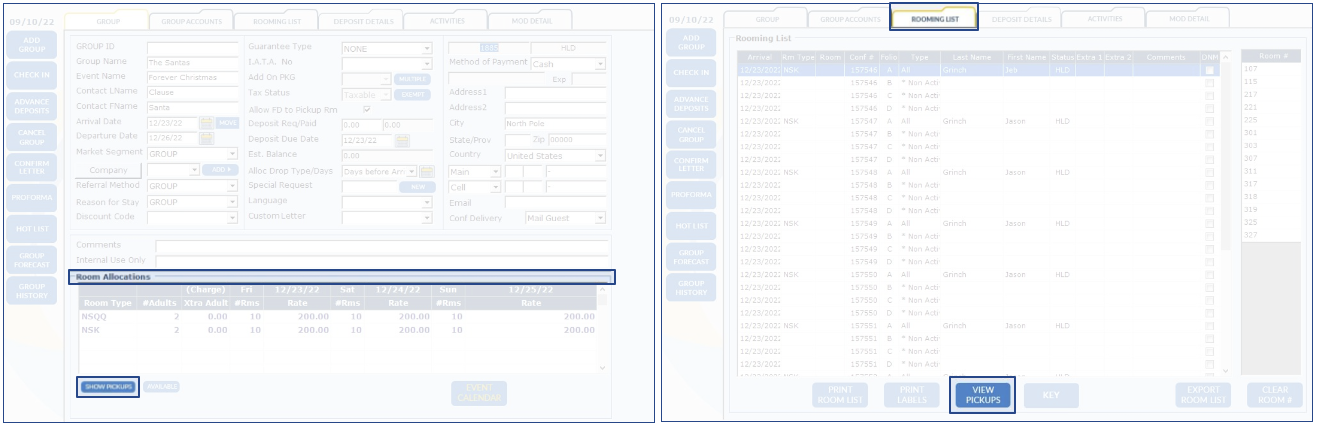 Path1: Front Office > Group > Search > Open the Group > Show Pickups (at the bottom of the page under the Room Allocation table).