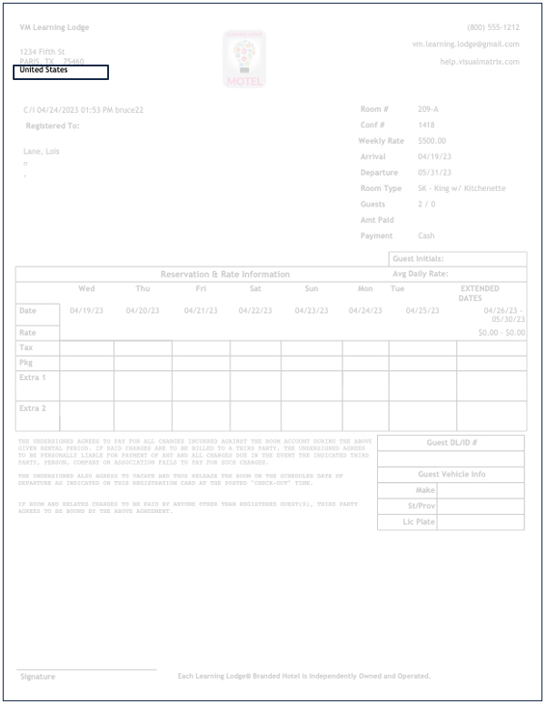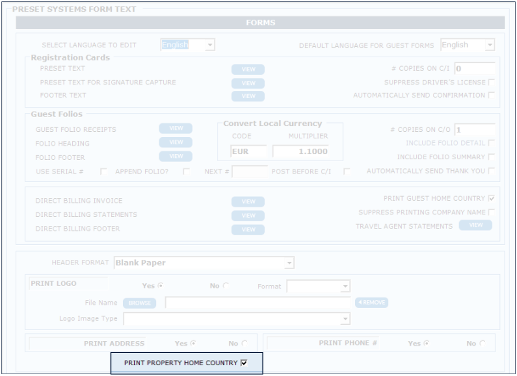 The Guest Home Country shows at the top left of a form under their general address, as shown below. Path: Management > Setup > Property > Forms To hide or show the Guest Home Country, follow the next steps. In the middle right side, check/uncheck the ...