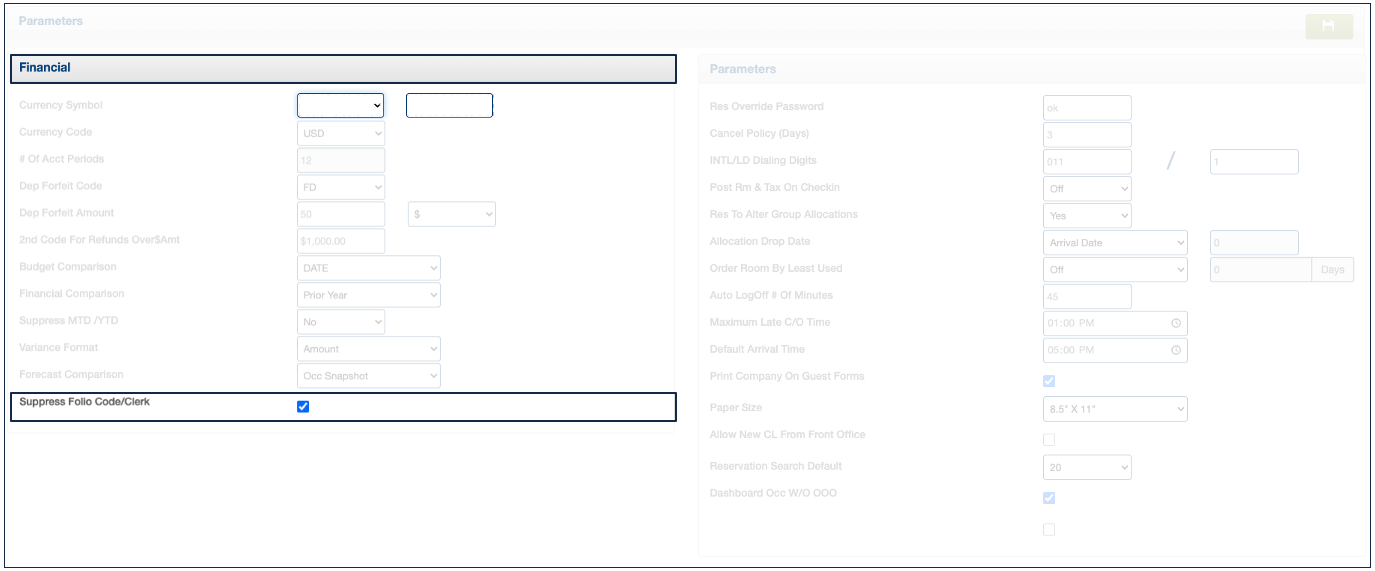 1. Check the box "Suppress Folio Code/Clerk" to hide the information from folios.