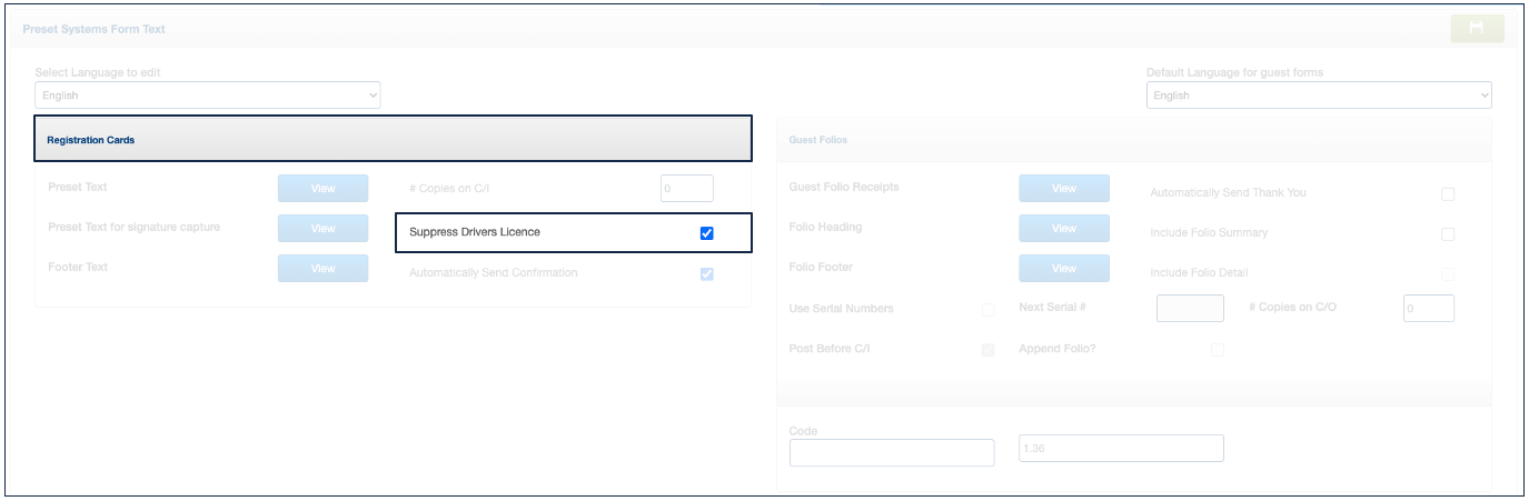 1. On the left side, in the "Registration Cards" section, check the box "Suppress Drivers License".