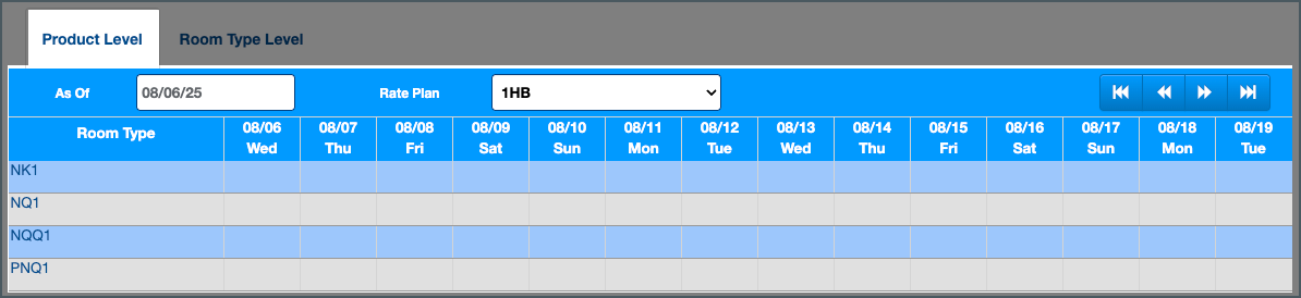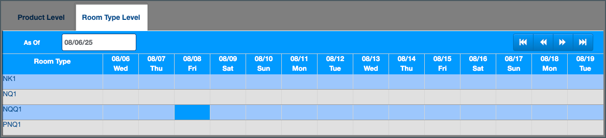 The "Room Type Level" tab solely displays auto-closed days, which occur when the system closes a room type due to overbooking. This tab is view-only and cannot be modified.