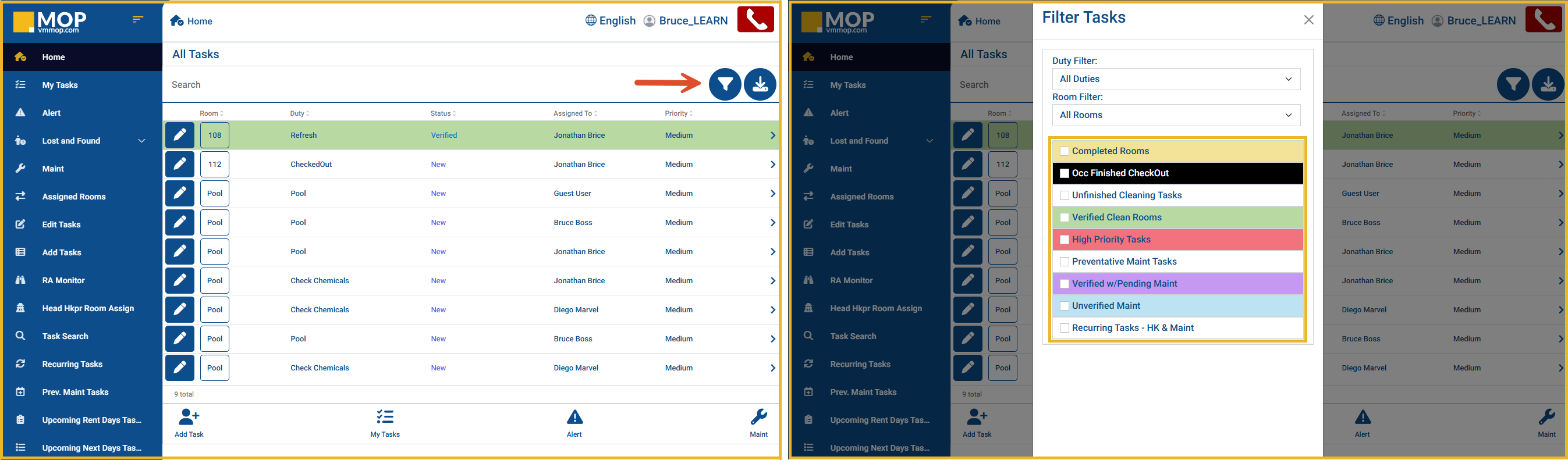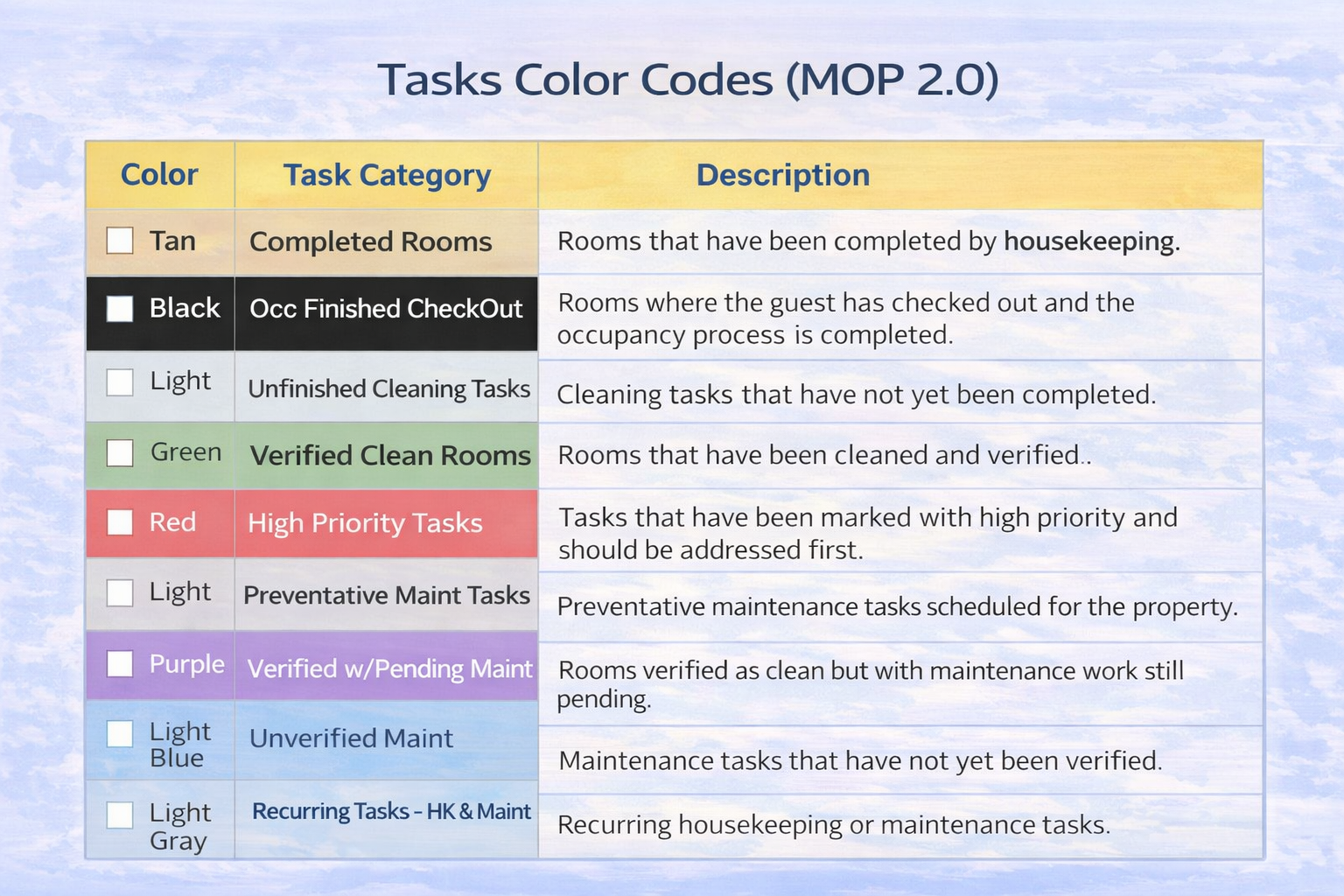 MOP allows you to monitor task progress in real time. Whether you are reviewing housekeeping, maintenance, or front desk duties, the system provides consistent status information across multiple areas of the application. This article explains where ...