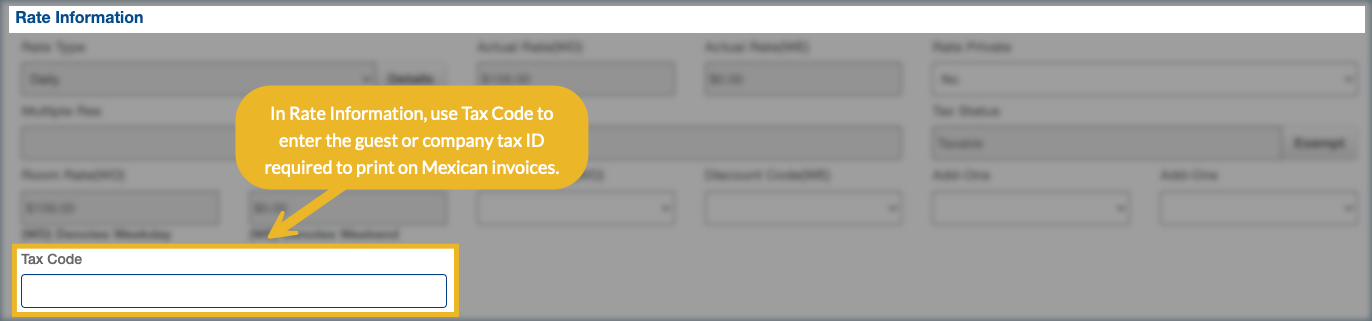 For Mexico-based properties, reservations often require a guest or company tax identifier to print correctly on fiscal documents. The Tax Code field in Add Res captures that identifier so it appears on invoices generated in VM Cloud. The field only appears when Mexico localization is enabled for the property.