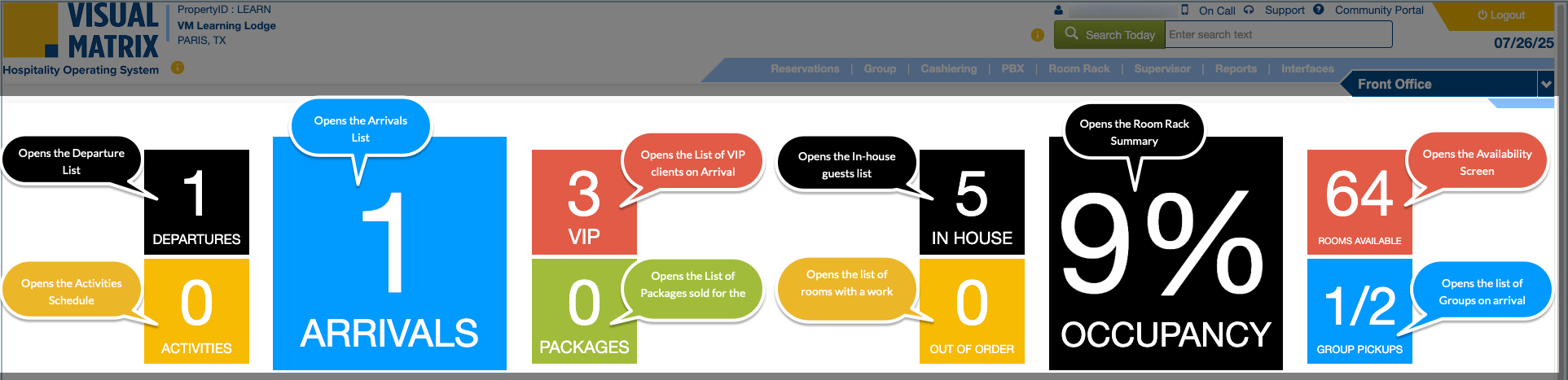 Your VM Cloud Dashboard offers visual shortcut tiles that put critical property information front and center. These tiles quickly link you to detailed views for arrivals, departures, occupancy, and more—helping you monitor operations at a glance.