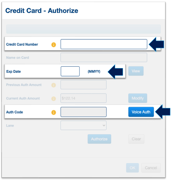 On VM Desktop PMS, you cannot enter a Voice Auth if your interface is not offline or if the credit card is not declined first. If you had to get voice authorization because your interface was offline or because of an outage and now you need to enter ...