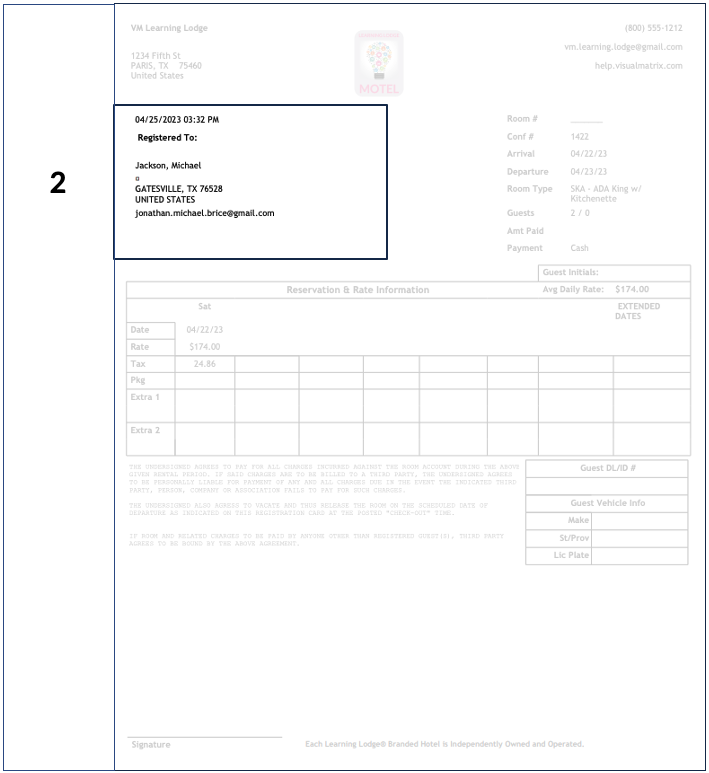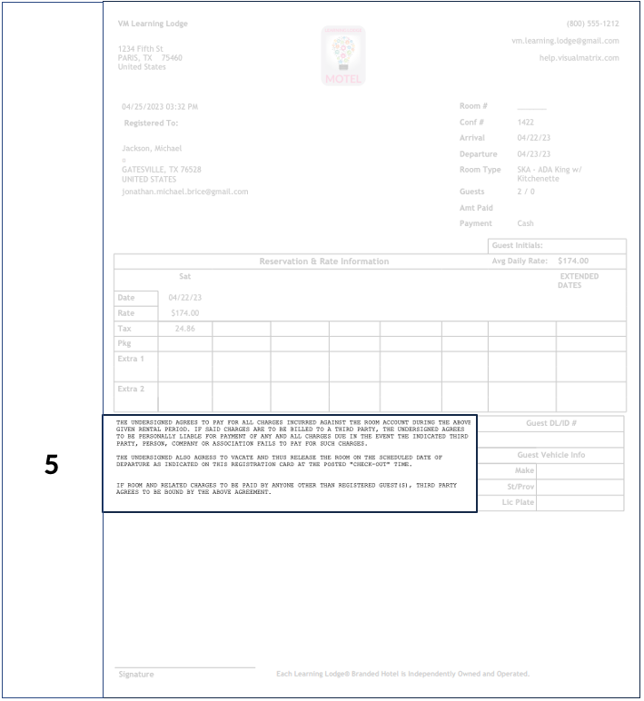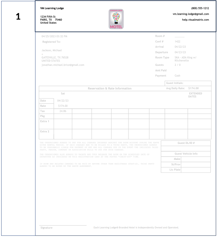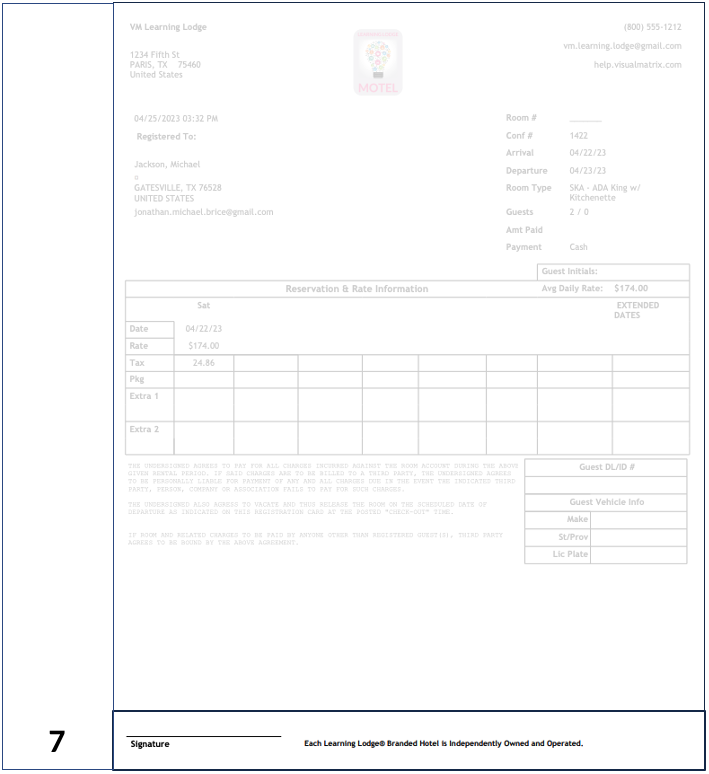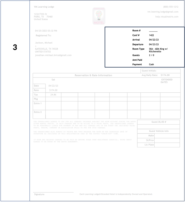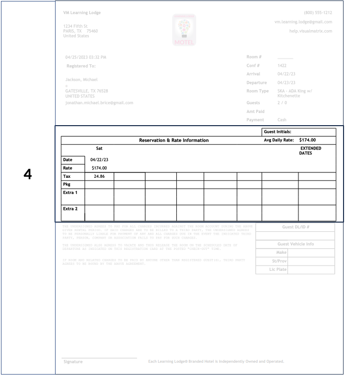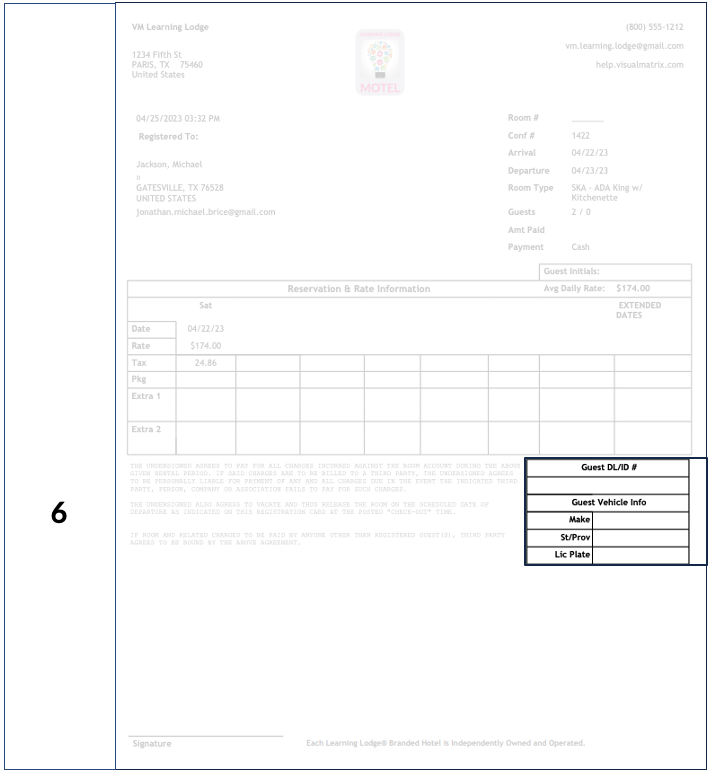 The guest's driver's license information is displayed on the right side of the Registration Card next to the rates information, as shown below. Path: Management > Property Settings > Forms 1. On the left side, in the "Registration Cards" section, ...