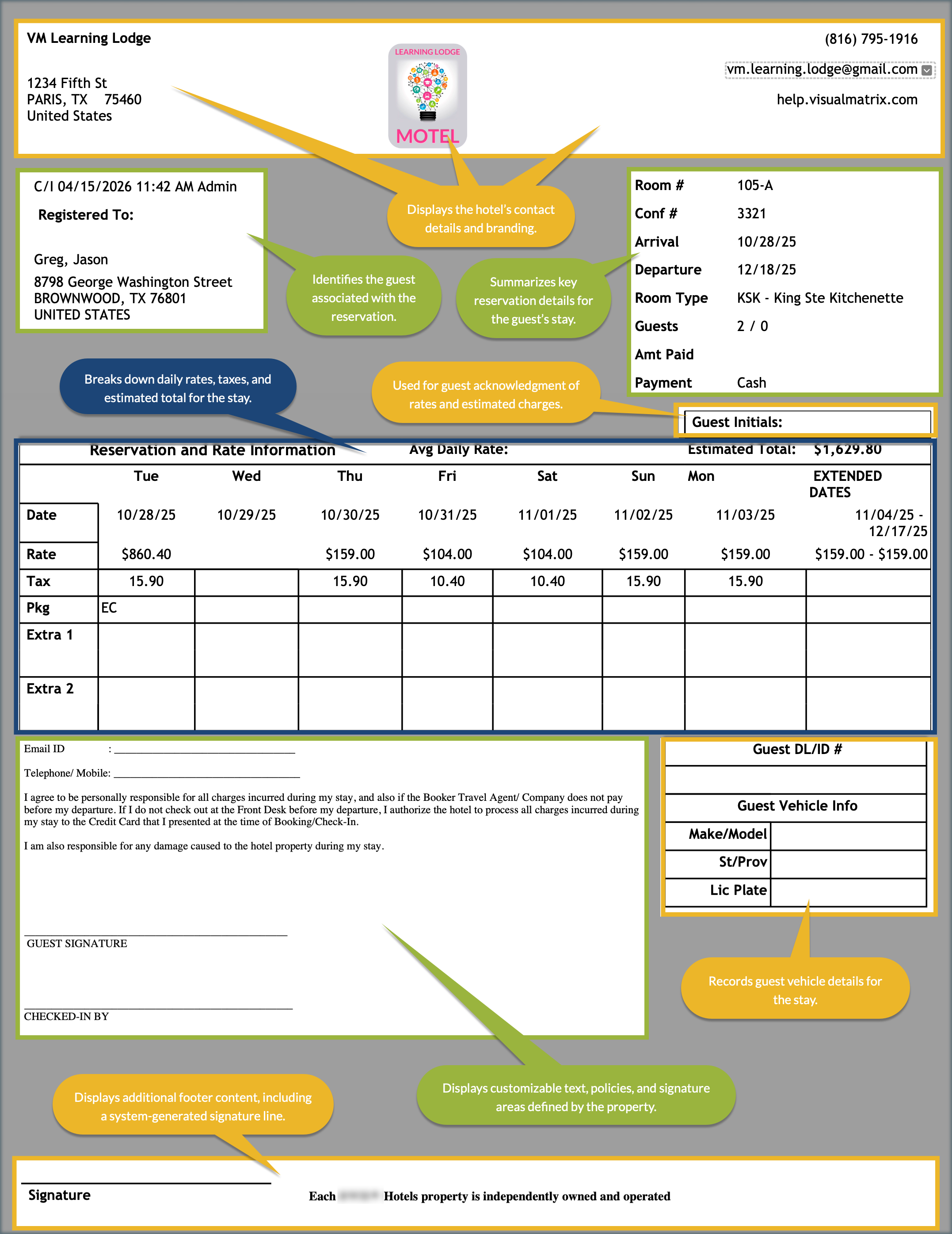 The registration card is organized into sections that display property information, guest details, reservation data, rate breakdown, and signature areas.