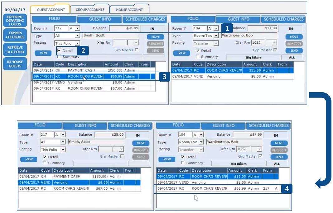 ? Watch Video Path: Front Office > Cashiering > Guest Account 1. Access the guest's folio by either typing the room number into the Room # box and using the drop-down to select folio A or select In House Guests on the left to locate the folio. 2. ...