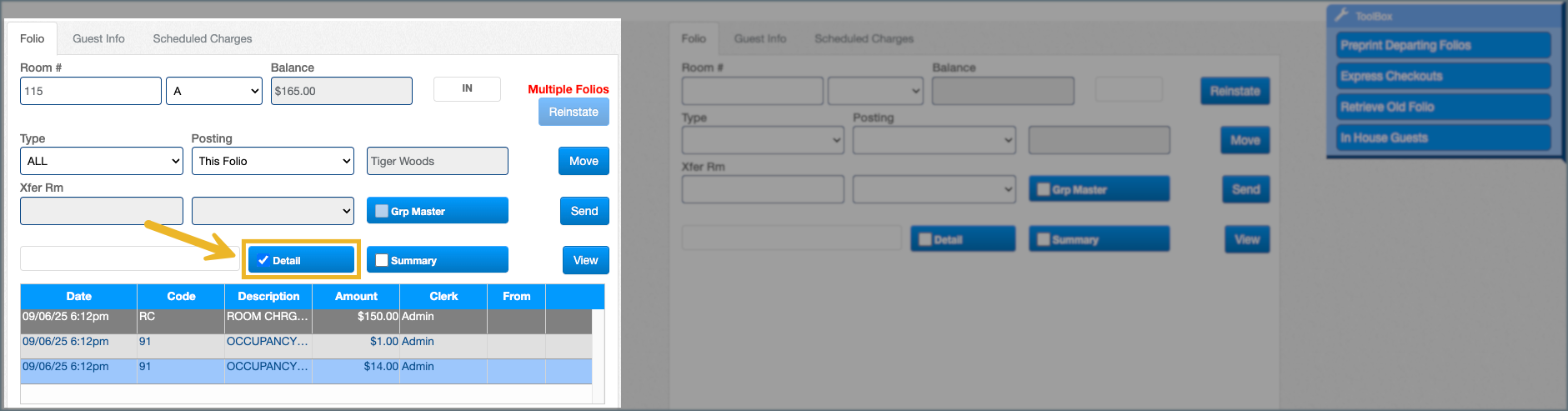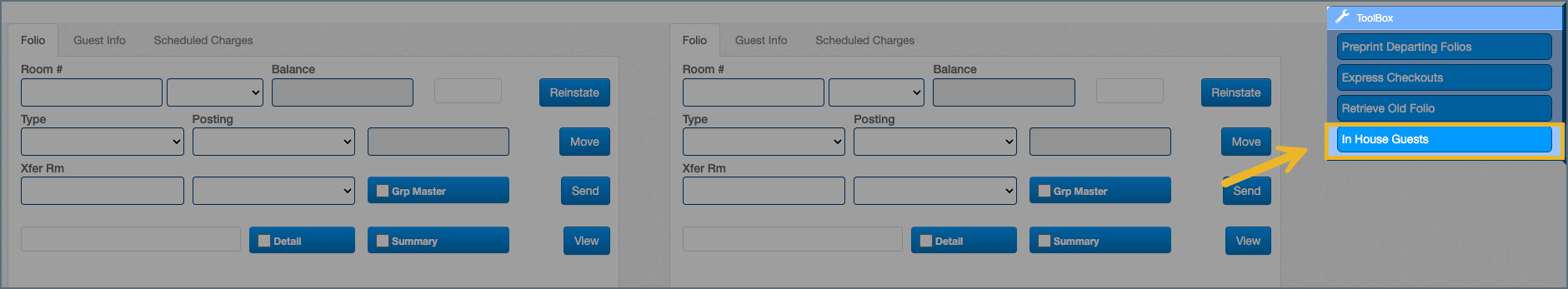 1. In the Toolbox on the right, select In-House Guests to view all current folios.