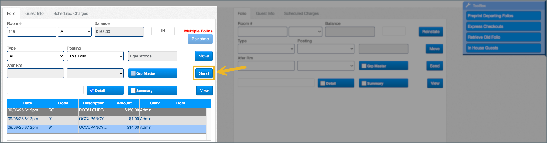 5. Click Send to transfer the selected charge(s) to the group master folio.