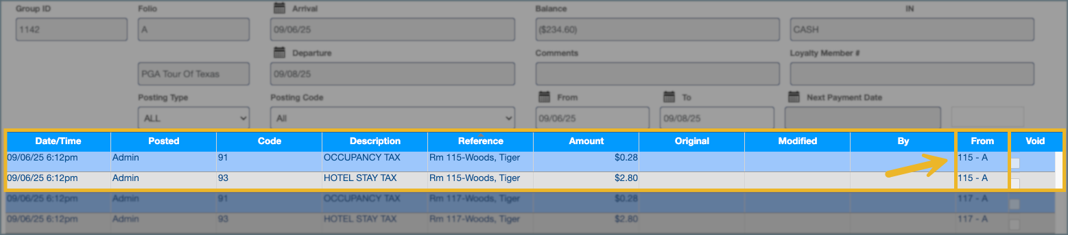 6. Confirm that the transferred charge now appears on the group master folio.
