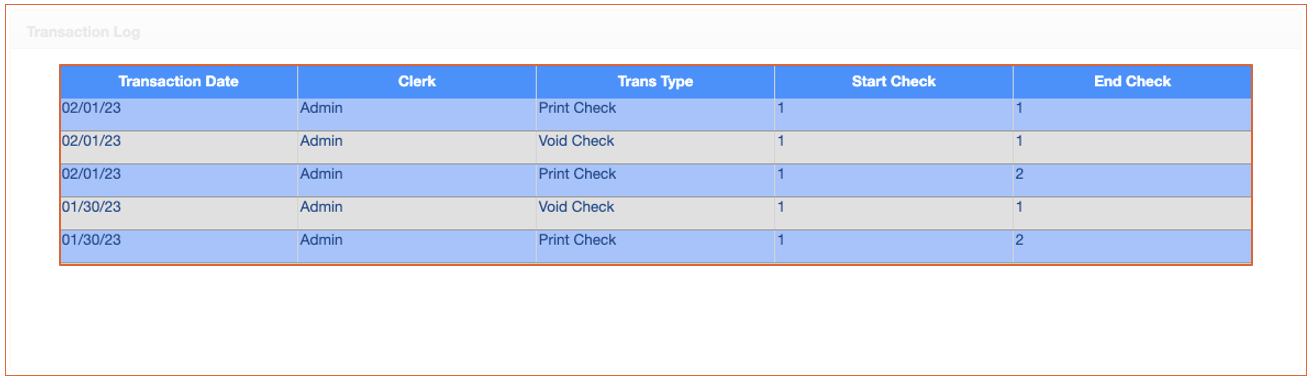 The Travel Agent Transaction log shows anytime a check or a statement was printed, as well as when a check is voided.