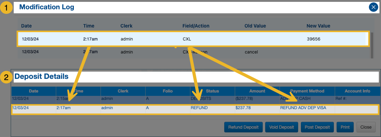 If a cancellation is done online and an advance deposit exists, the system automatically refunds using the original payment method. Since it's automated, "Admin" appears as the clerk.