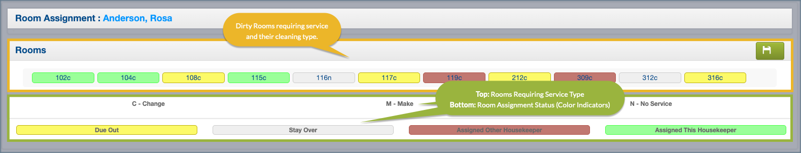 - Green: Assigned to the selected room attendant.