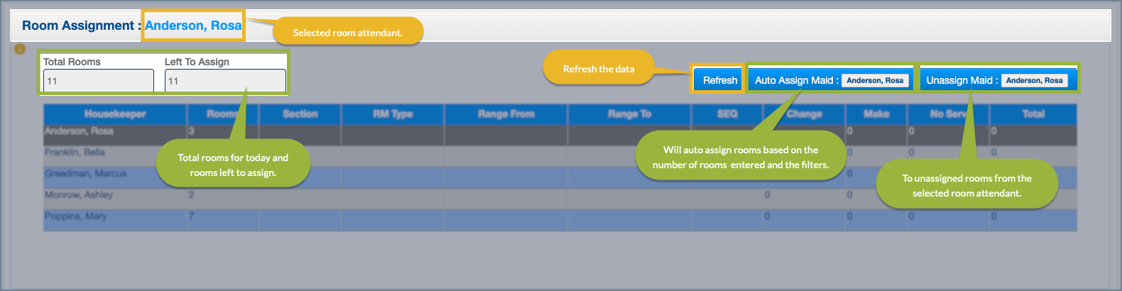 - Unassign Maid removes assigned rooms from the selected attendant.