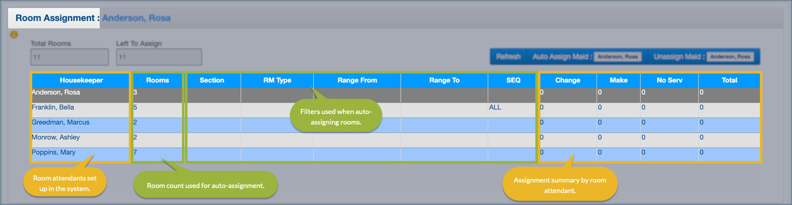 The number shown next to each room attendant reflects how many rooms were assigned during the last assignment and directly determines how many rooms to auto-assign. This value is specific to auto-assignment behavior.
