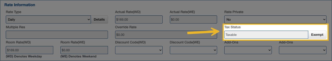 If a reservation’s tax status needs to be corrected after checkout, you can change the status to “Tax Exempt.” However, charges that were already posted with tax will not automatically adjust. To correct this, void the original room & tax charges and repost the room-only charge without tax.