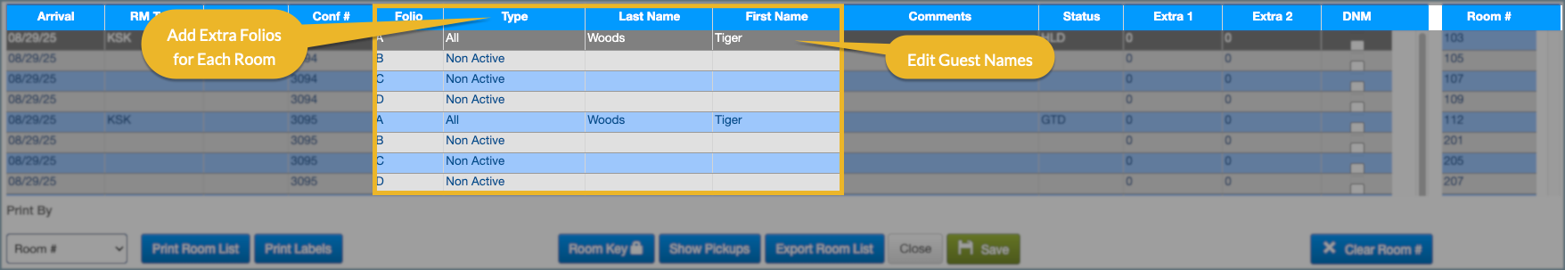 2. In the Last Name and First Name columns, update guest names as needed. You can also create additional folios for each room to manage separate billing types, such as a Room & Tax folio and an Incidental folio.