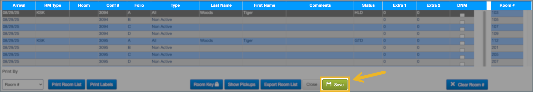 6. When all updates are complete, click Save to apply your changes. After saving, you can close the Rooming List window.