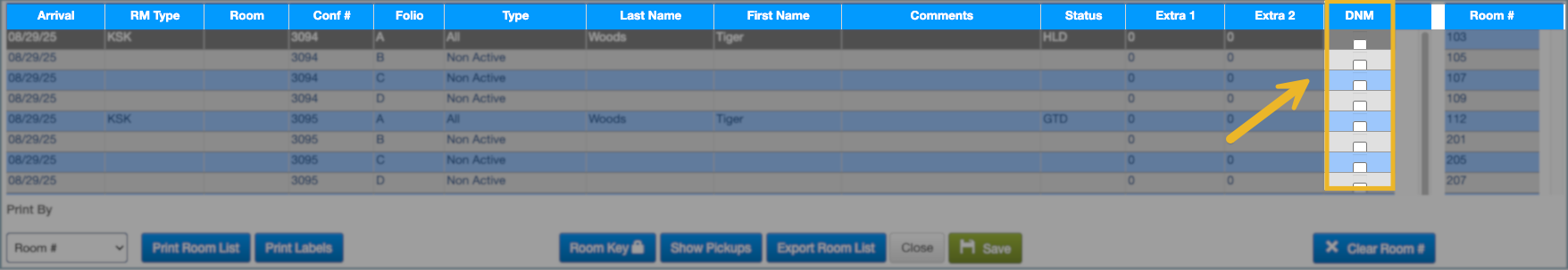4. Mark Do Not Move (DNM): Check the DNM box if the guest should not be reassigned to another room.