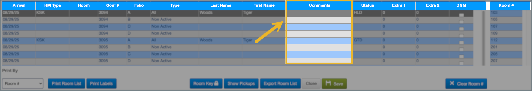 All updates made in the Rooming List—such as guest names, folios, room numbers, DNM status, and comments—will automatically update the linked guest reservations once saved.