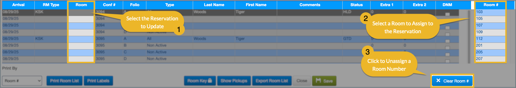 3. Assign or change room numbers using the list of available matching rooms on the right side of the screen. To remove a room number, click Clear Room #.