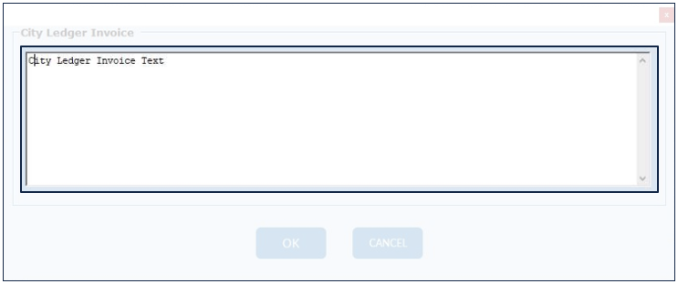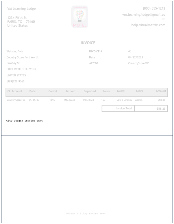 The City Ledger Direct Billing Invoice text is the text that is showing below the invoice detailed on the City Ledger Invoice, as shown below.