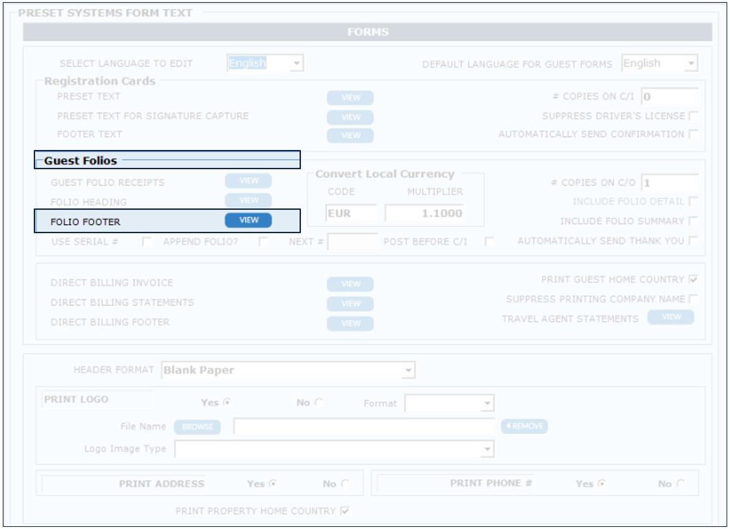 1. In the "Guest Folios" section, click on "View" next to "Folio Footer".