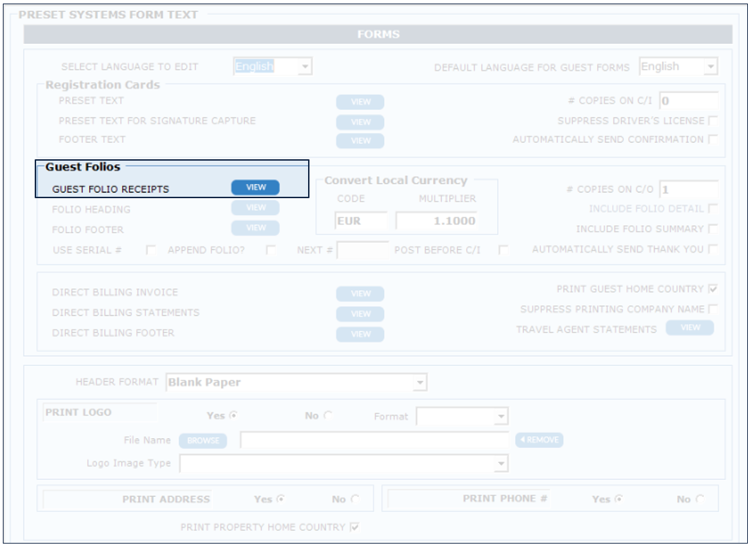 1. In the "Guest Folios" section, click on "View" next to "Guest Folio Receipts".