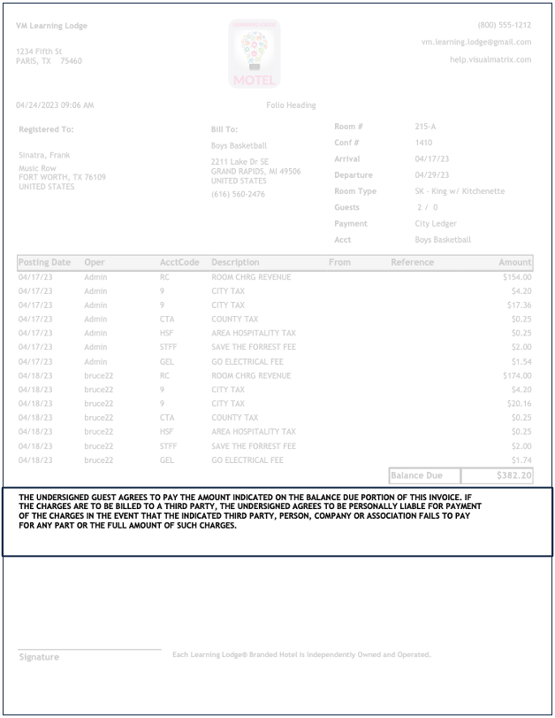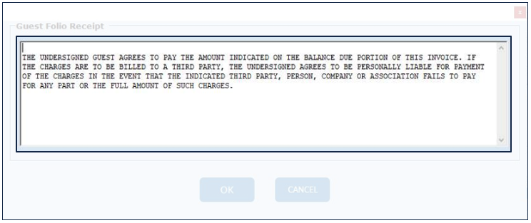The Folio Footer is the phrase that is showing at the bottom of the folio, as shown below. The footer does not include the "Signature" showing at the bottom. This field is hard codded and cannot be removed. Path: Management > Setup > Property > Forms ...