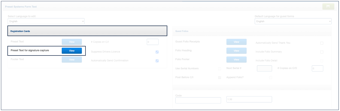 1. On the left side, in the "Registration Cards" section, click on "View" next to "Preset Text for Signature Capture".