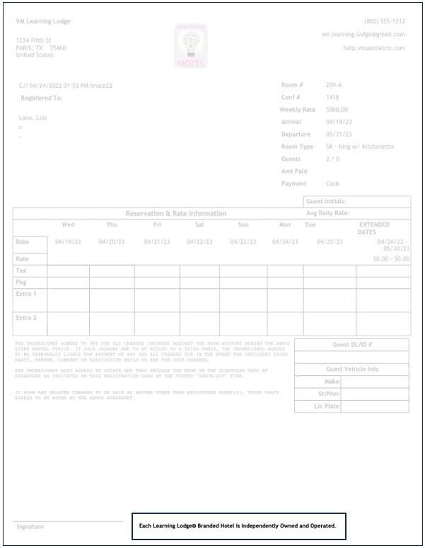 The guest's driver's license information is displayed on the right side of the Registration Card next to the rates information, as shown below. Path: Management > Property Settings > Forms 1. On the left side, in the "Registration Cards" section, ...