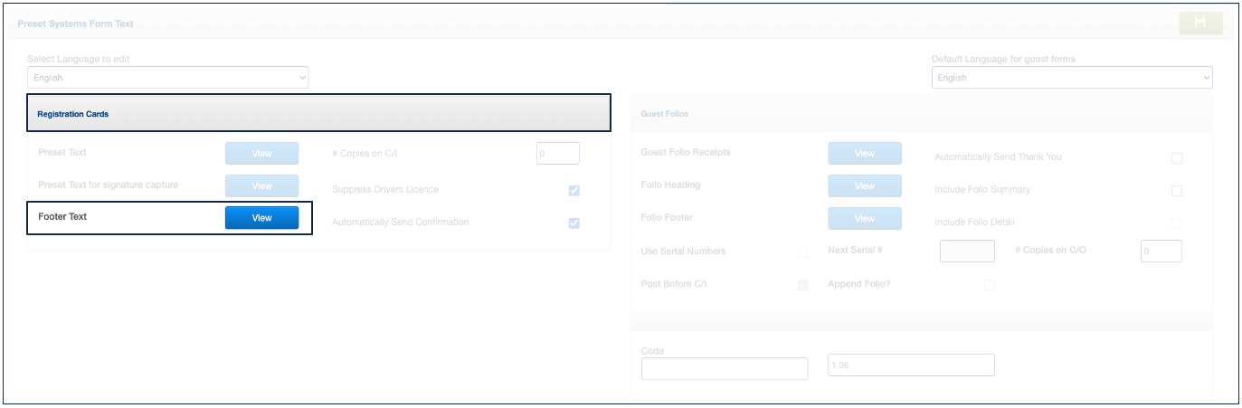 1. On the left side, in the "Registration Cards" section, click on "View" next to "Preset Text".