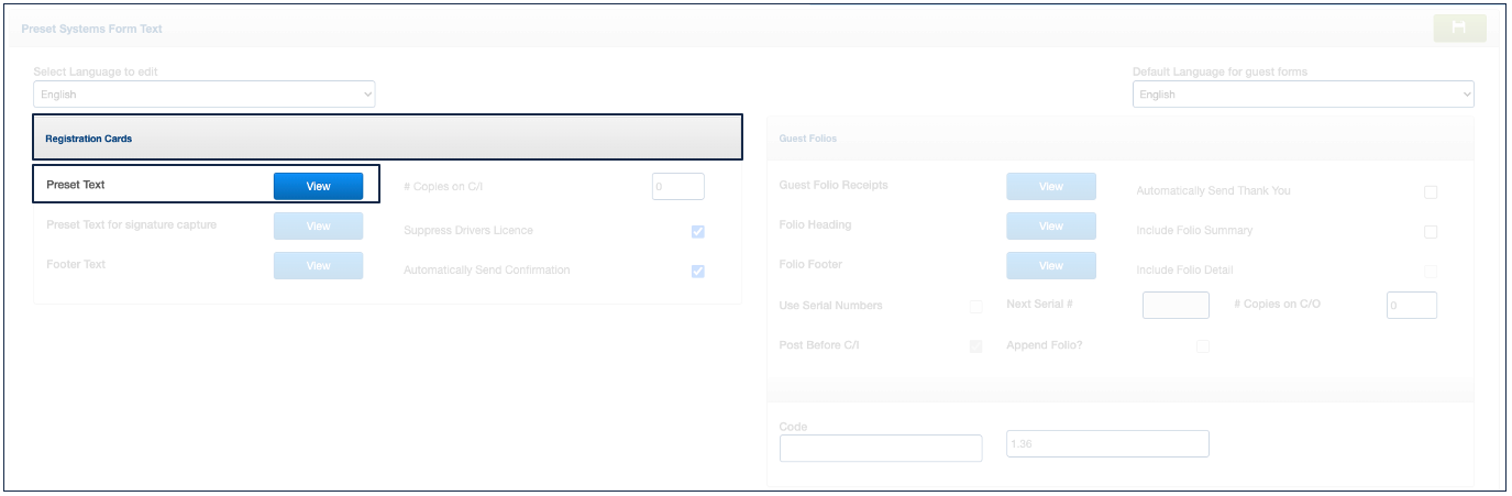 1. On the left side, in the "Registration Cards" section, click on "View" next to "Preset Text".