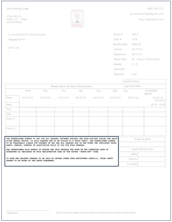 The guest's driver's license information is displayed on the right side of the Registration Card next to the rates information, as shown below. Path: Management > Property Settings > Forms 1. On the left side, in the "Registration Cards" section, ...